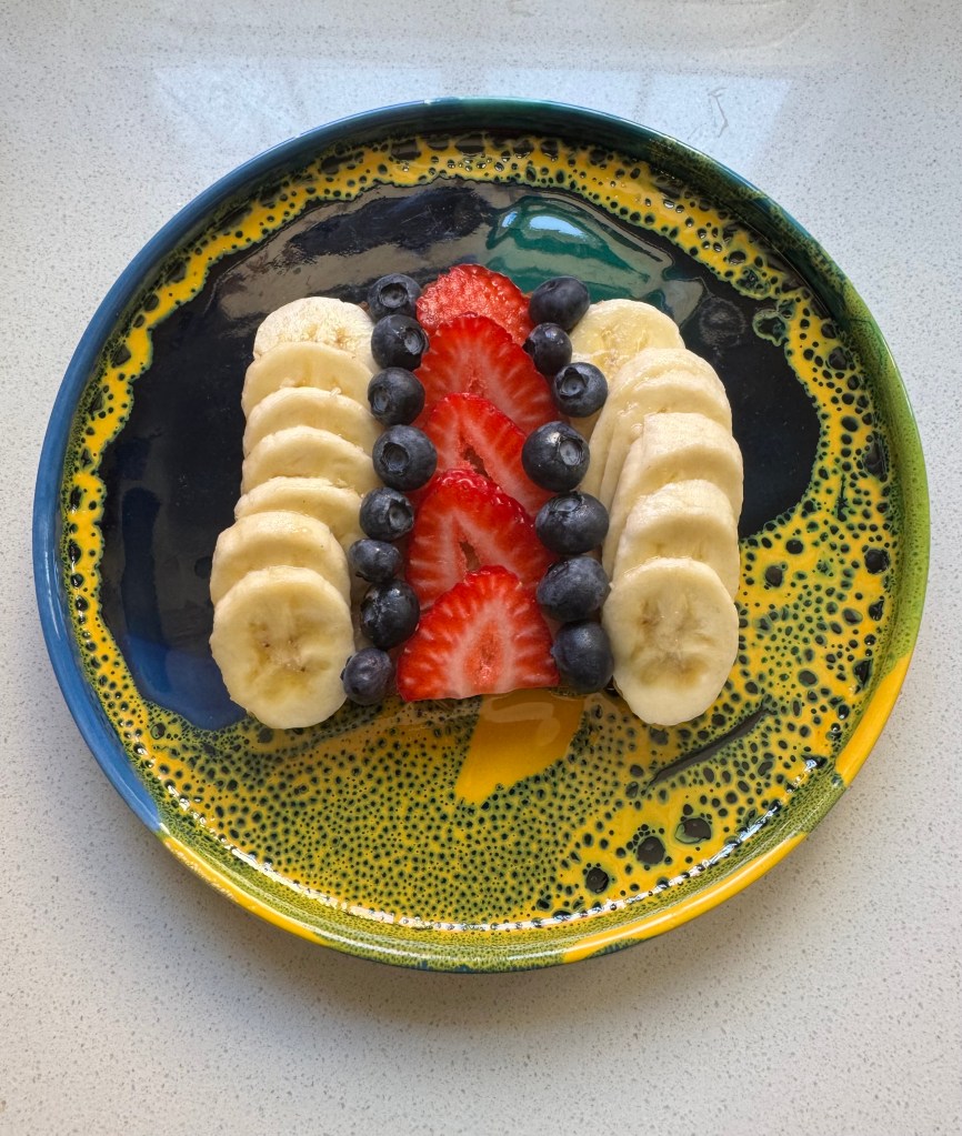 Arrange the blueberries, sliced strawberries, and banana slices on top of the peanut butter.